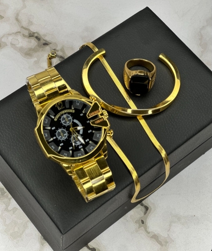 باکس هدیه مردانه لوکس – ساعت طلایی + عطر ۳۵۹ + کمربند