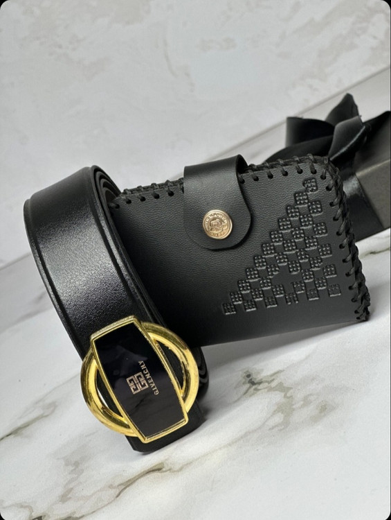 کمربند مشکی داخل ست، از جنس مرغوب بوده و سگک طلایی آن ترکیب رنگی پک را کامل میکند. این کمربند برای هر تیپ و استایلی مناسب است و کاربردیترین آیتم این باکس محسوب میشود.