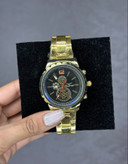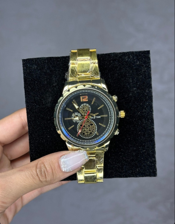 ساعت موجود در این پک، با بند و قاب تمامفلزی و رنگ طلایی براق، جلوهای کاملاً جذاب و لاکچری دارد. طراحی صفحه و موتور نمایان آن باعث شده ساعت هم برای استفاده روزمره مناسب باشد و هم برای استایل رسمی فوقالعاده جلوه کند.