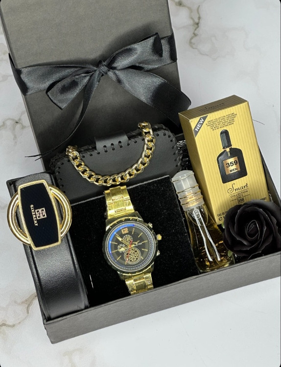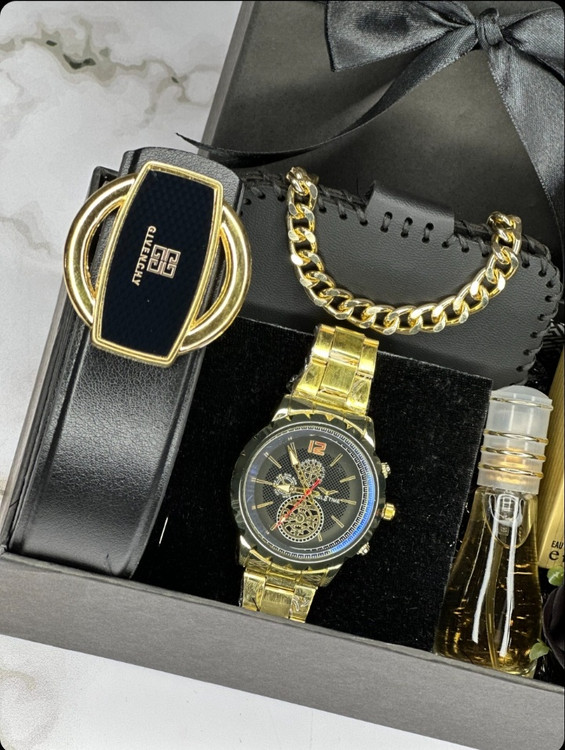بسته شامل: ساعت + عطر + کمربند + کیف پول + زنجیر + گل رز