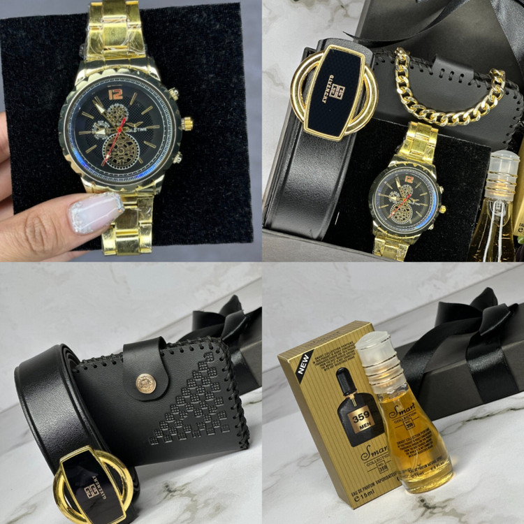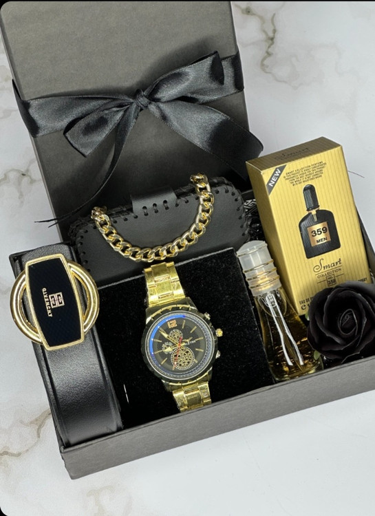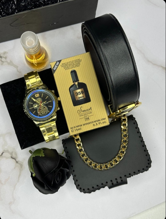 باکس هدیه مردانه لوکس – ساعت طلایی + عطر ۳۵۹ + کمربند